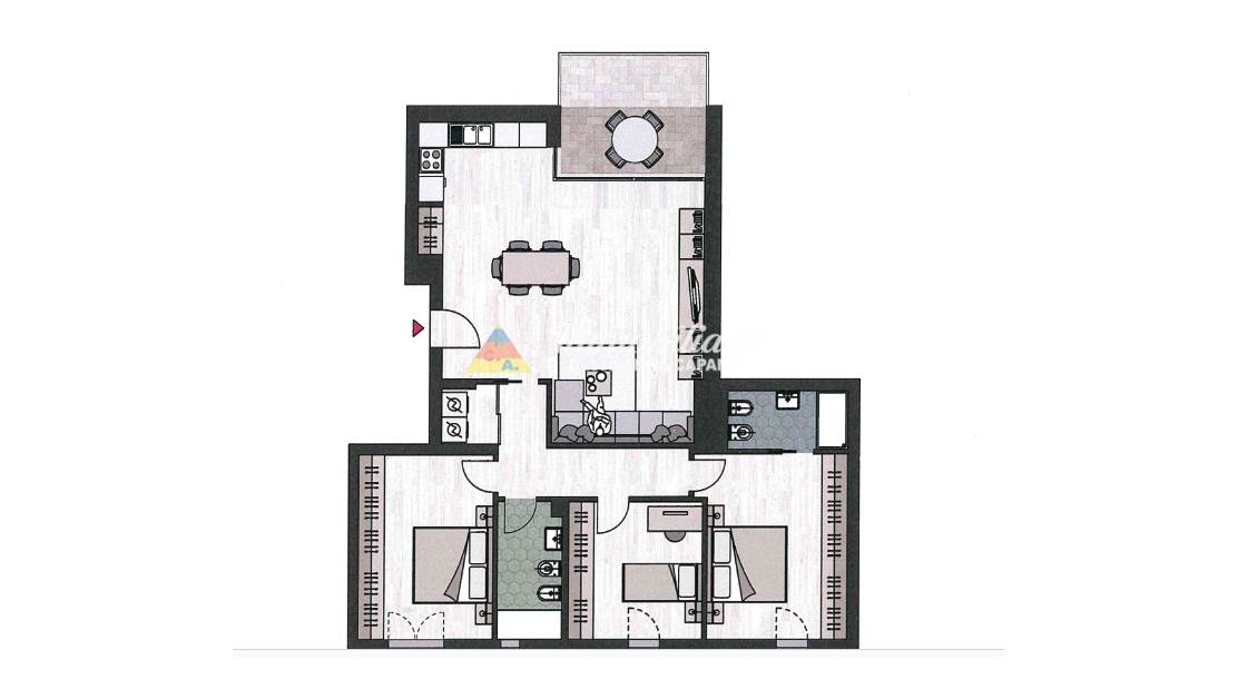 126 MQ, ingresso diretto nel generoso open space con cucina a vista e accesso tramite elegante vetrata alla terrazza con loggia, disimpegno notte, lavanderia, due camere matrimoniali, una camera singola/studio, due servizi con box doccia, di cui uno finestrato.