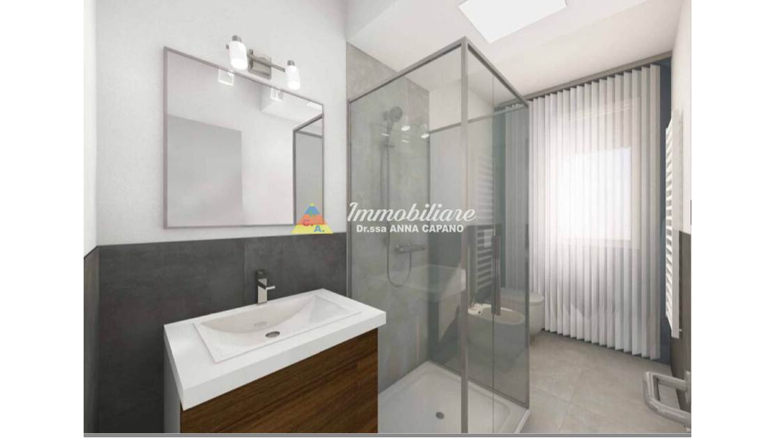 95MQ, Ingresso su disimpegno, soggiorno con cucina a vista con affaccio su terrazzo di 40mq, camera matrimoniale con accesso al secondo terrazzo di 11mq, servizio finestrato.