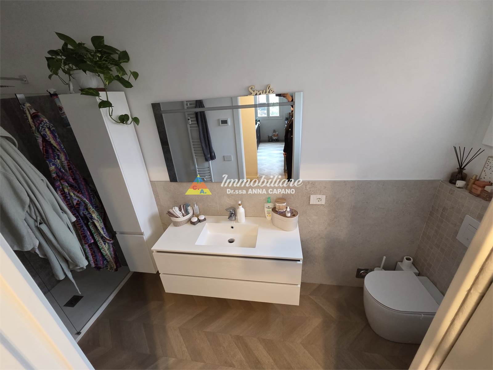 80MQ, ampio ingresso arredabile, sala grande con cucina a vista e accesso alla TERRAZZA DI 6 MQ, camera matrimoniale di oltre 18 mq con accesso al SECONDO BALCONE (e possibilità di realizzazione della seconda camera, ripristinando lo stato legittimo, con una spesa di circa € 10.000), servizio finestrato con box doccia, ripostiglio con angolo lavanderia.